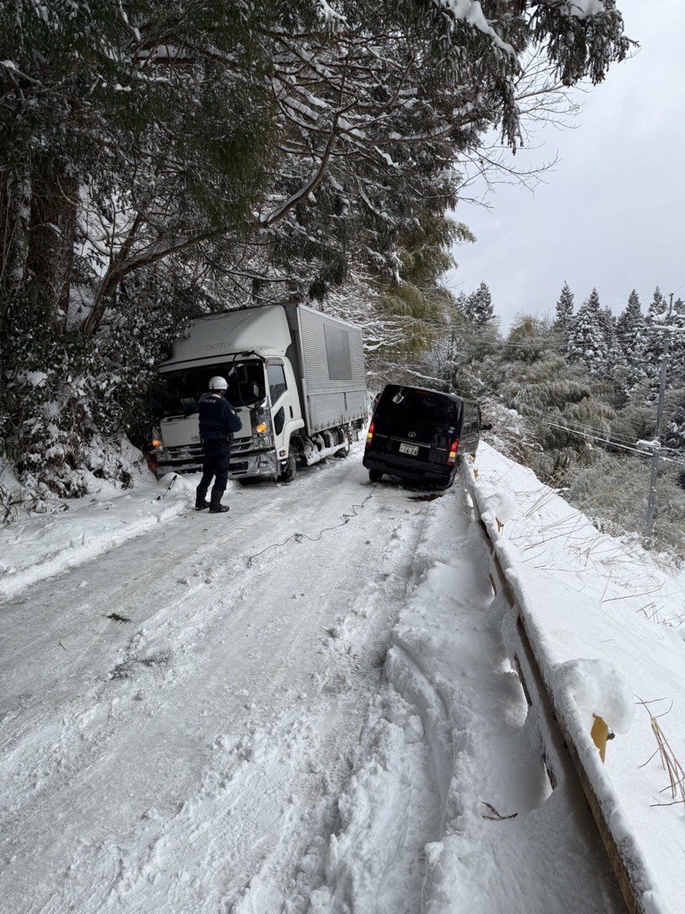 2月9日、降雪による中国自動車道通行止め規制時に、う回路として国道434号を利用して広島方面に抜ける際に、写真のような事故が発生し、生活道路が使用できなくなっている事案が発生しました。